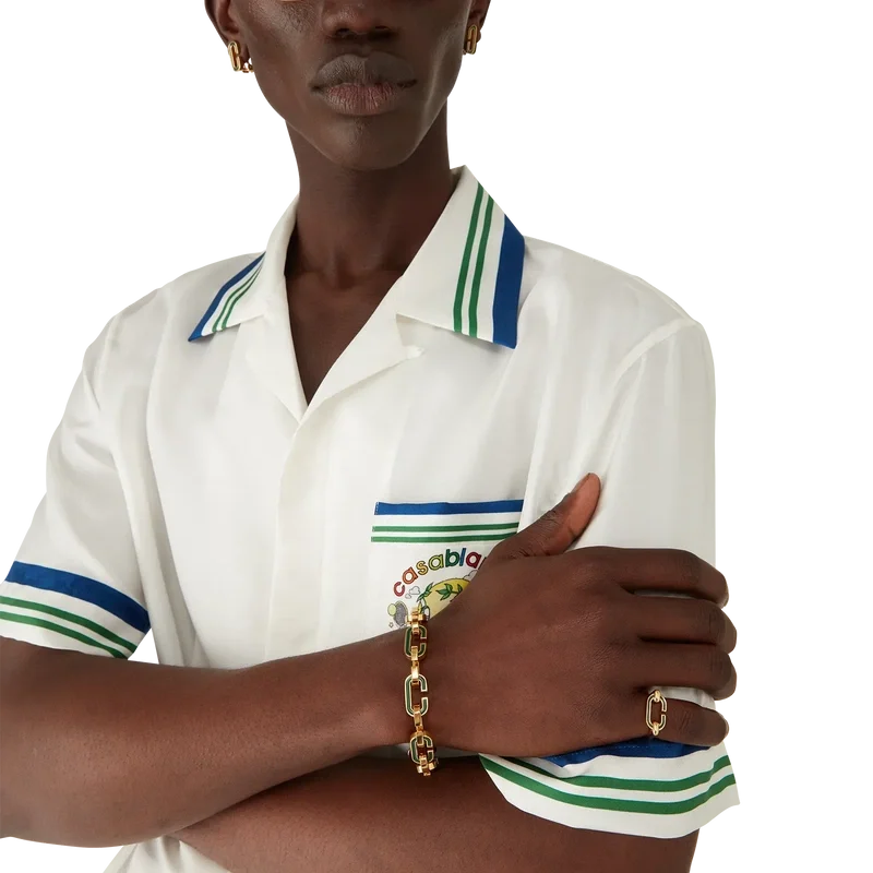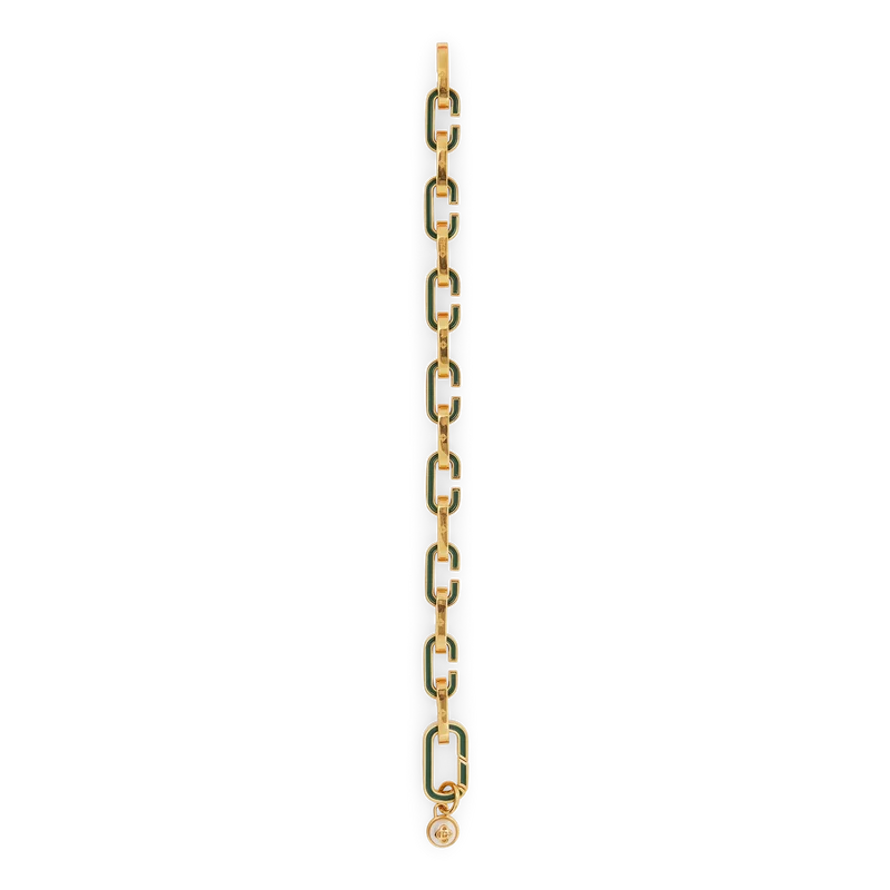 «C»-lenkearmbåndet er laget av gullbelagt messing og emalje. Fullført med en grønn, håndmalt emalje «C»-lenke og gullbelagt kjede.