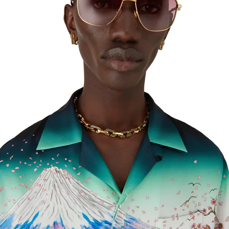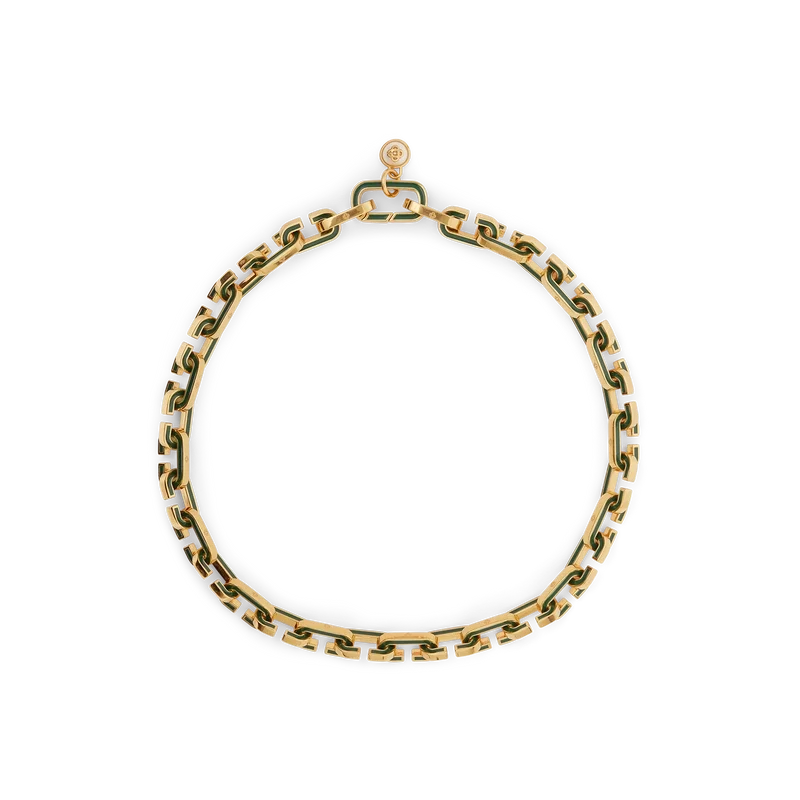 «C»-lenkehalskjedet er laget av gullbelagt messing og emalje. Komplett med en grønn, håndmalt emalje «C»-lenke i gullbelagt kjede.