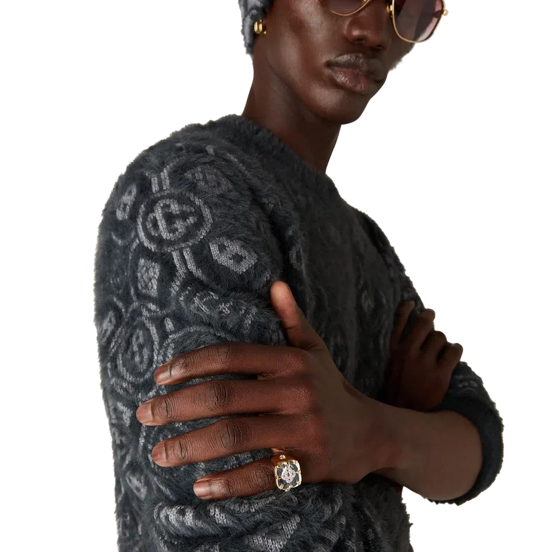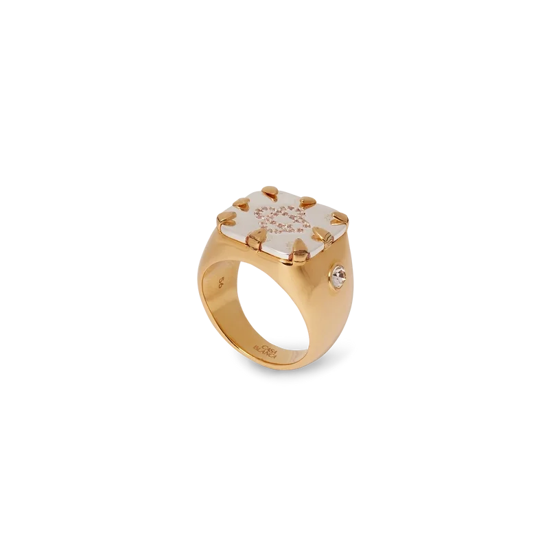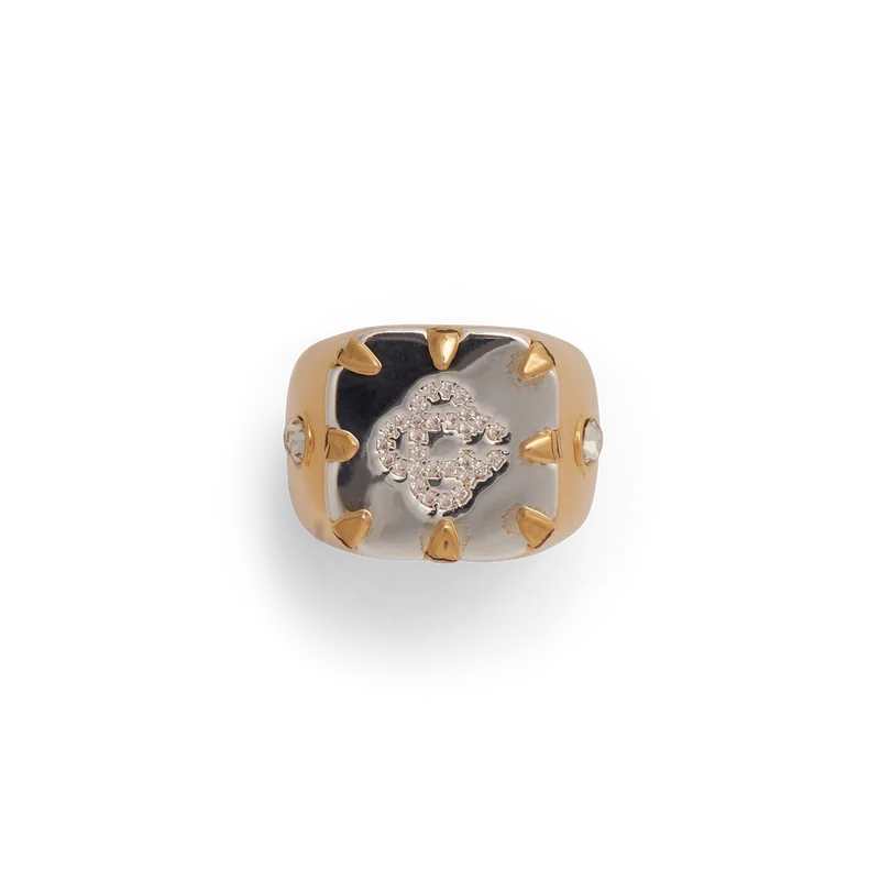 Cc Logo Signetringen er laget av gullbelagt messing, sølv og krystaller. Den er utstyrt med husets karakteristiske sammenflettede Cc-logo på toppen, pyntet med krystaller, og ringbenet har en enkelt krystall på hver side.