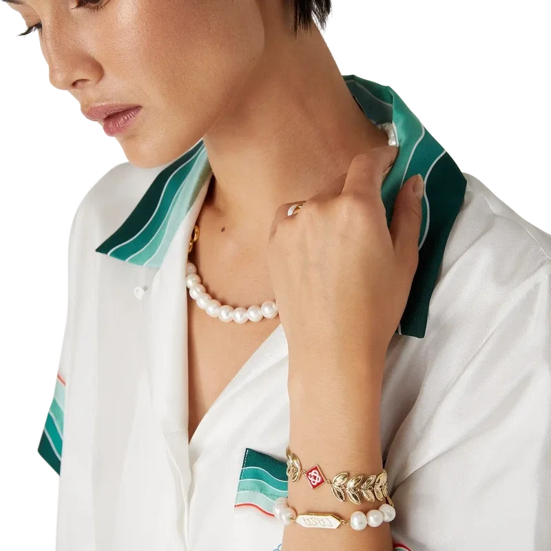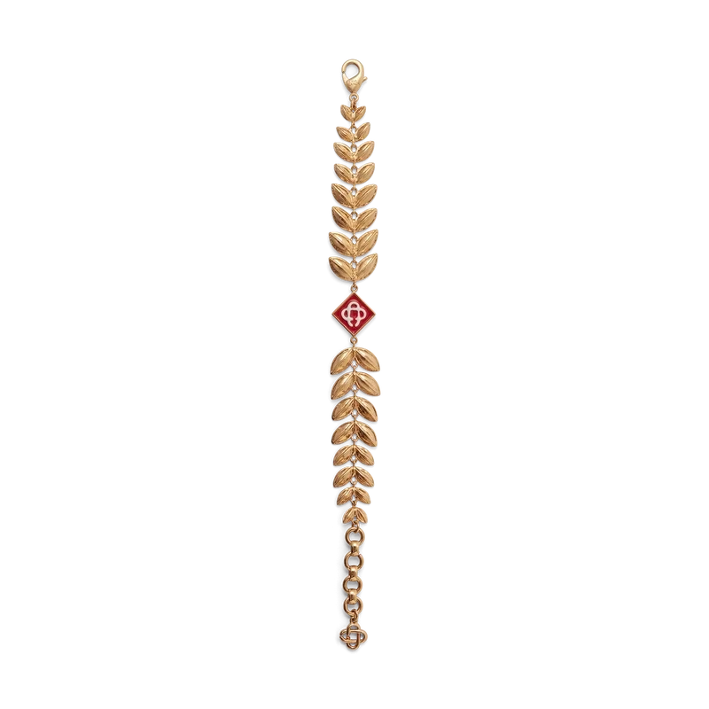 Det gullbelagte laurbærbladarmbåndet har husets karakteristiske laurbærbladmotiv og diamantlogo laget av messing og håndmalt emalje. Fullført med en gullbelagt kjede og karabinkrok – dette smykket leveres med gaveeske, støvpose med merke og produktbrosjyre.