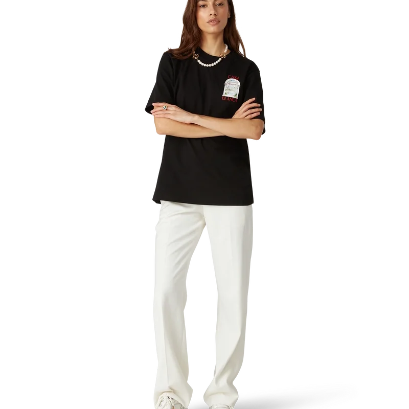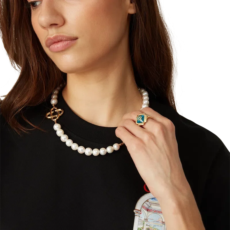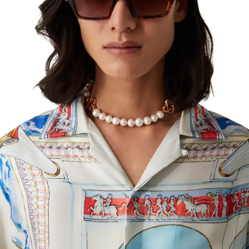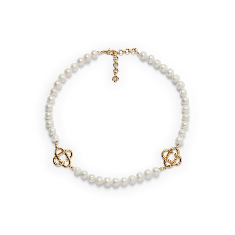 Medium Pearl Logo-halskjedet har Casablanca-logoen på tvers av halsen, og er designet for å sitte tett. Halskjedet er 18K gullbelagt og har 30 store ferskvannsperler.