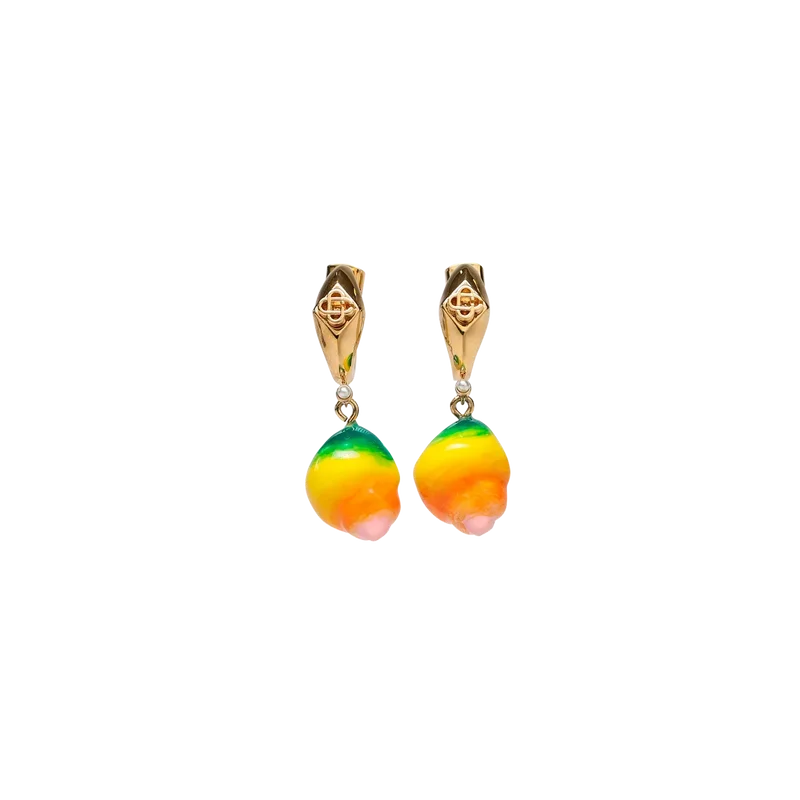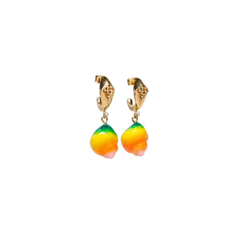 Shell Drop-øreringene er laget av gullbelagte messingringer med husets sammenflettede CC-logo og mini-skjell i regnbuefarger. Fullført med glassperler.
