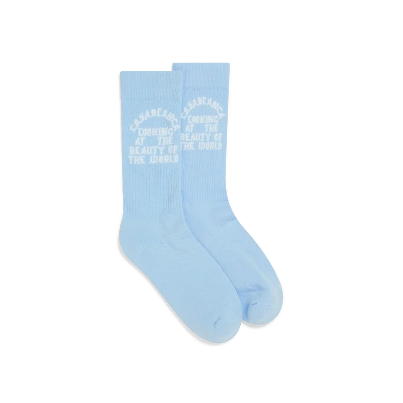 Beauty of the World-sokkene er laget av en bomullsblanding og har Casablanca-merkevarens motto i gotisk typografi inspirert av street-kulturen. Med ribbestrikkede ben.