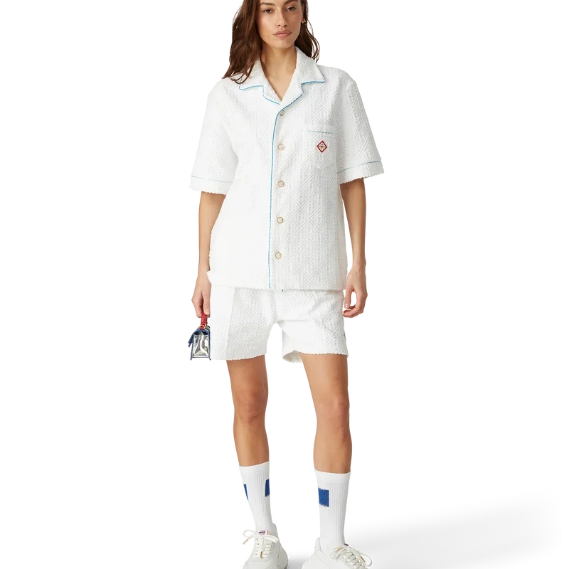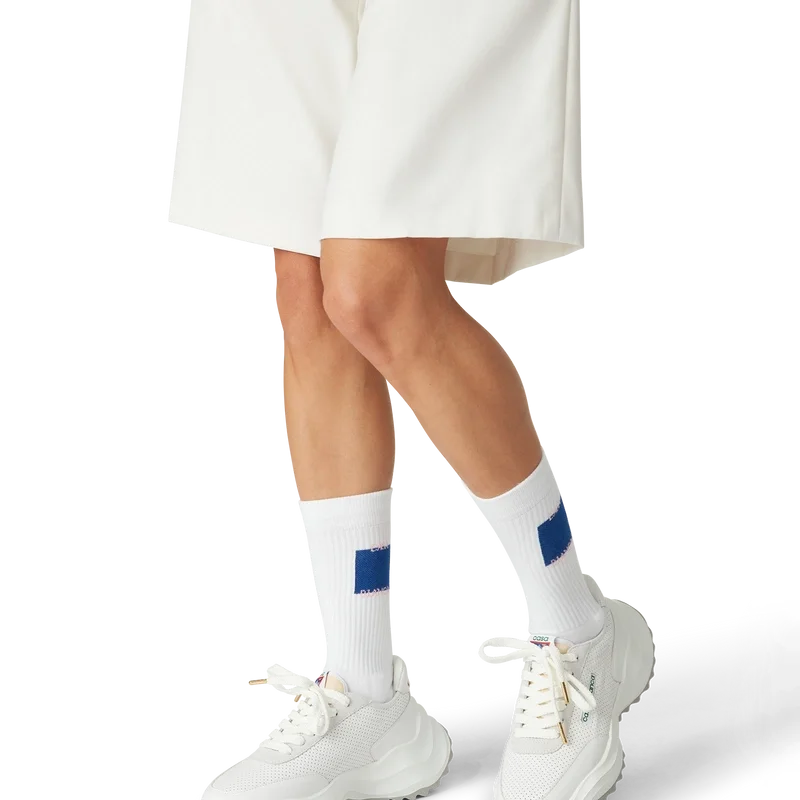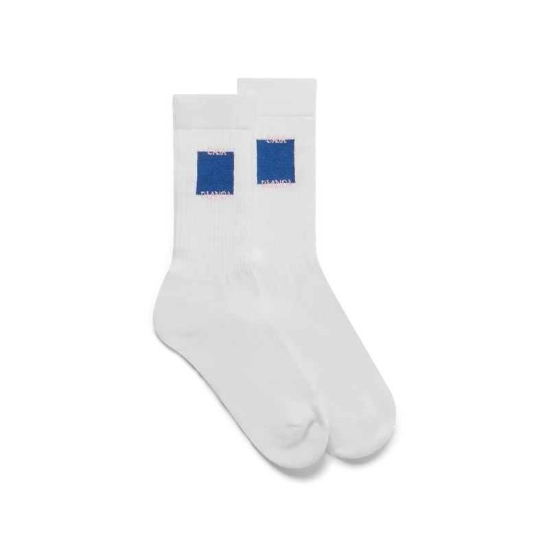 De blå Casa Square-sokkene er laget av et bomullsblandingsstoff og har husets stablede logo med et blått firkantdesign. Med ribbestrikkede ben.