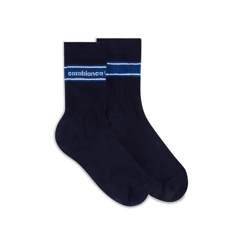 De sporty stripete sokkene har et raffinert design med stripete detaljer. Dette plagget legemliggjør husets Apras-Sport-estetikk med sofistikerte atletiske koder. Fullført med ribbestrikkede ben og et kontrastfarget Casablanca-logo rundt mansjettene.
