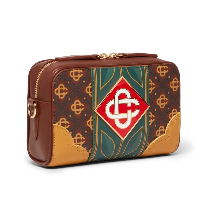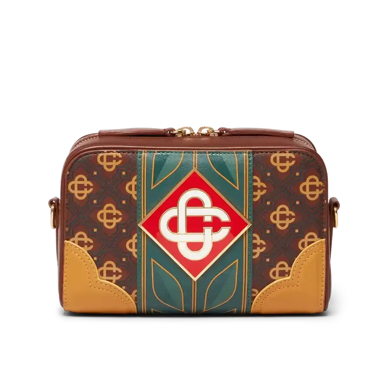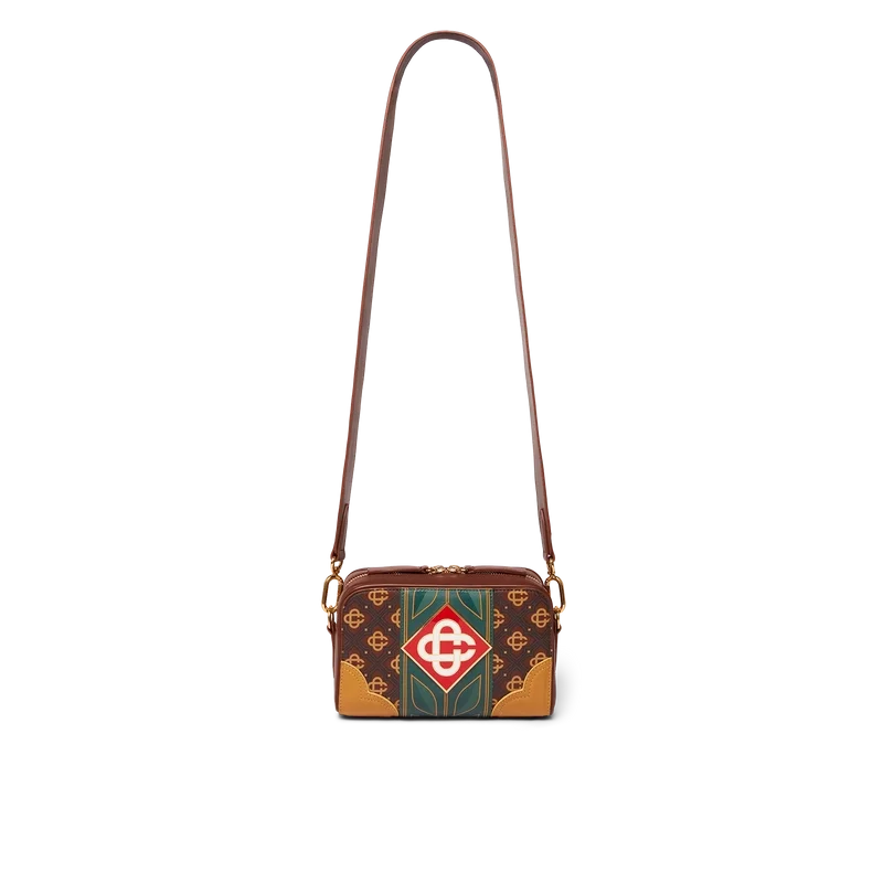 Den brune Monogram-vesken med skulderrem er laget av italiensk skinn, prydet med husets karakteristiske diamantlogo på siden. Komplett med husets karakteristiske laurbærmotiv, glidelåslukking, skulderrem, utvendig lomme med glidelås og innvendig lomme. Leveres med gaveeske, støvpose med merke og produktbrosjyre.