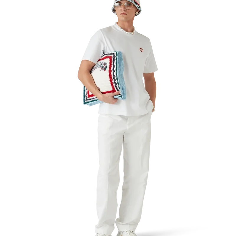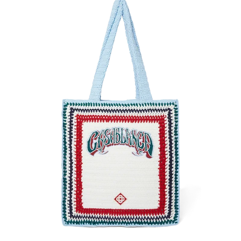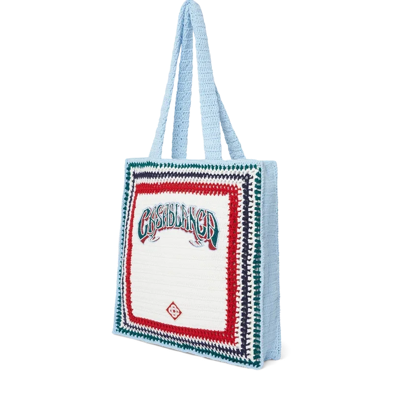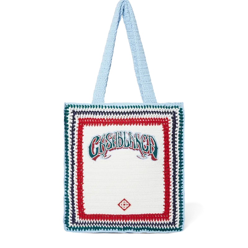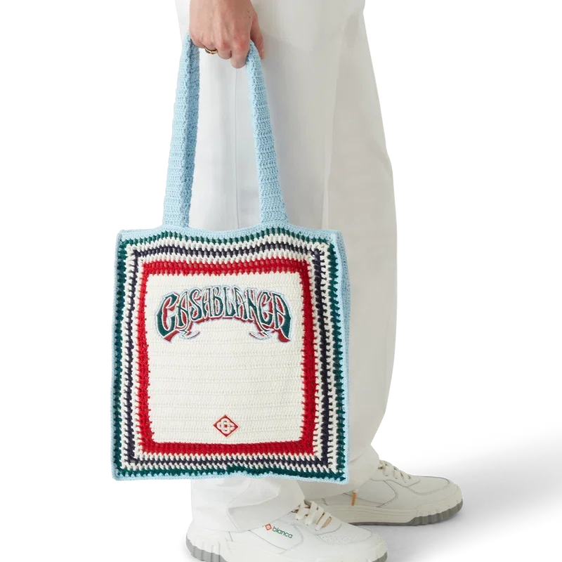 Den gotiske heklede vesken er en strikket modell laget av heklet bomullsstoff og har en avslappet silhuett. Den er utsmykket med brodert, håndtegnet typografi av Casablanca-logoen, inspirert av den gotiske skrifttypen som brukes i tatoveringer, og stropper som gjør at vesken kan bæres over skulderen eller i hånden.