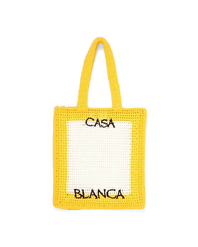Heklet veske er en gul og hvit modell designet for å fullføre et sommerantrekk. Vesken er laget av 100 % bomull og har en avslappet silhuett med et brodert svart logo og stropper som gjør at den kan bæres over skulderen eller i hånden.