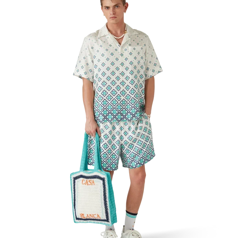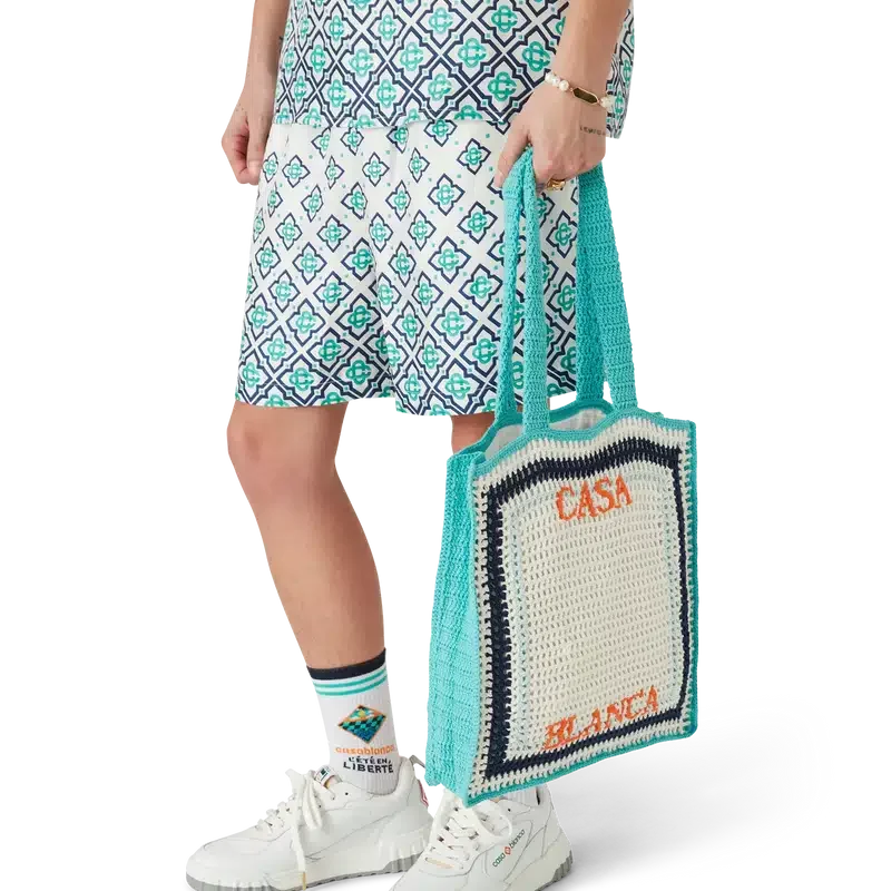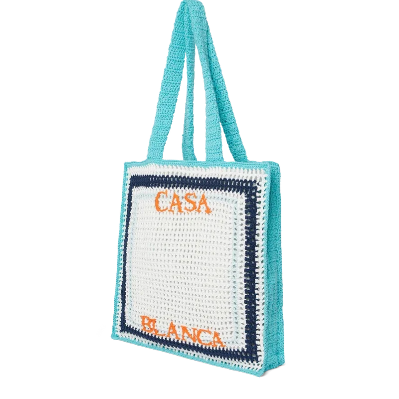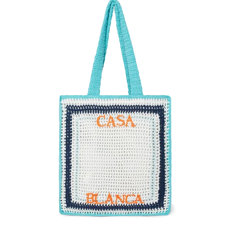 Stripe Crochet Bag er en strikket veske laget av heklet bomullsstoff og har en slapp silhuett. Den er utstyrt med et brodert Casablanca-logo og stropper som gjør at vesken kan bæres over skulderen eller i hånden.