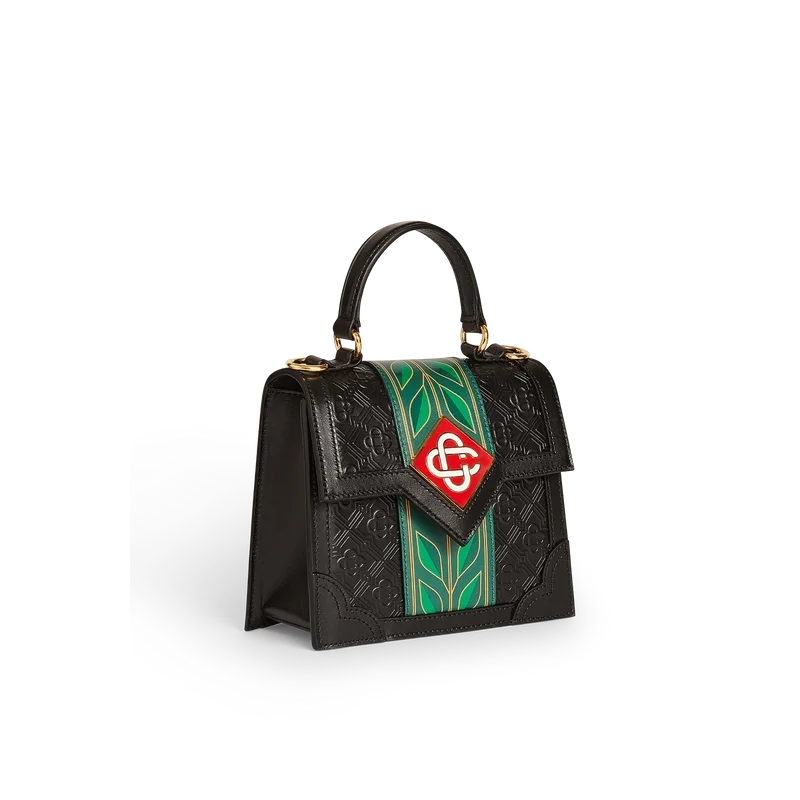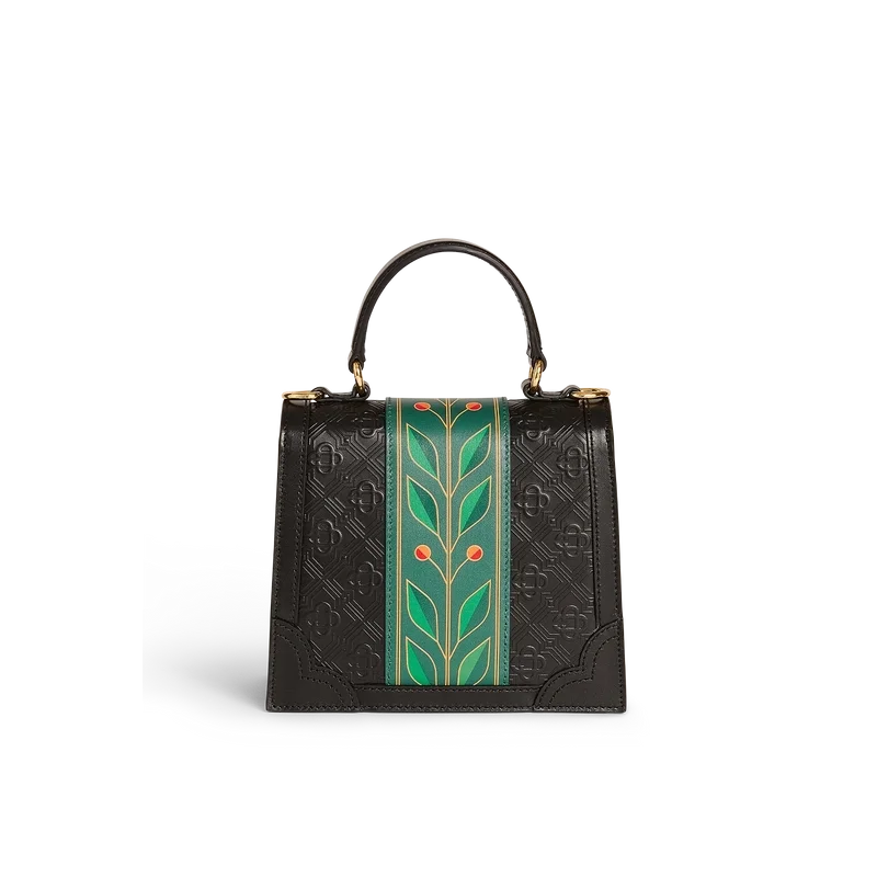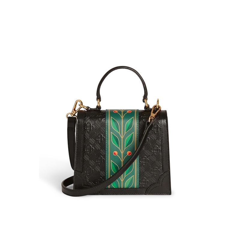 Den svarte Laurel Mini Jeanne-vesken er et klassisk design laget av italiensk kalveskinn med Monogram-mønster. Den er utstyrt med husets karakteristiske Laurel-motiv, en lærrem og gullbelagte messingbeslag.