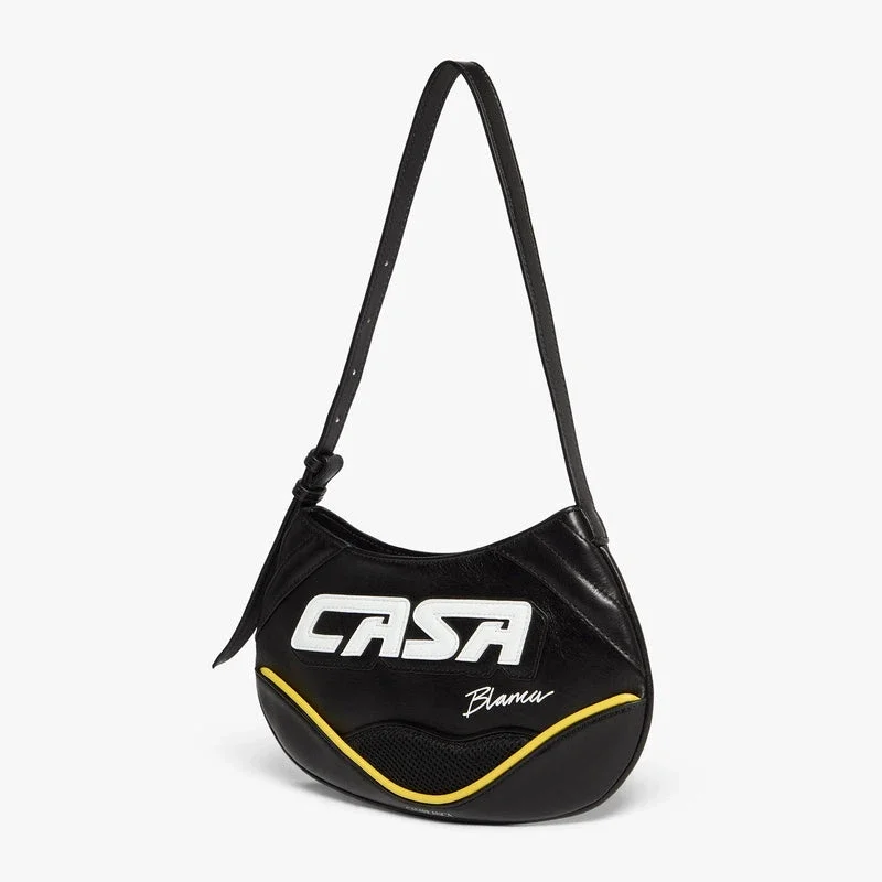 Den svarte, slanke biker-vesken er laget av skinn, med husets Casa-inskripsjon på forsiden. Komplett med skulderrem, glidelåslukking, kontrastpiping, sølvbelagte metallbeslag og en elegant silhuett designet for uanstrengt hverdagsbruk. Leveres med gaveeske, støvpose med merke og produktdetaljhåndbok.