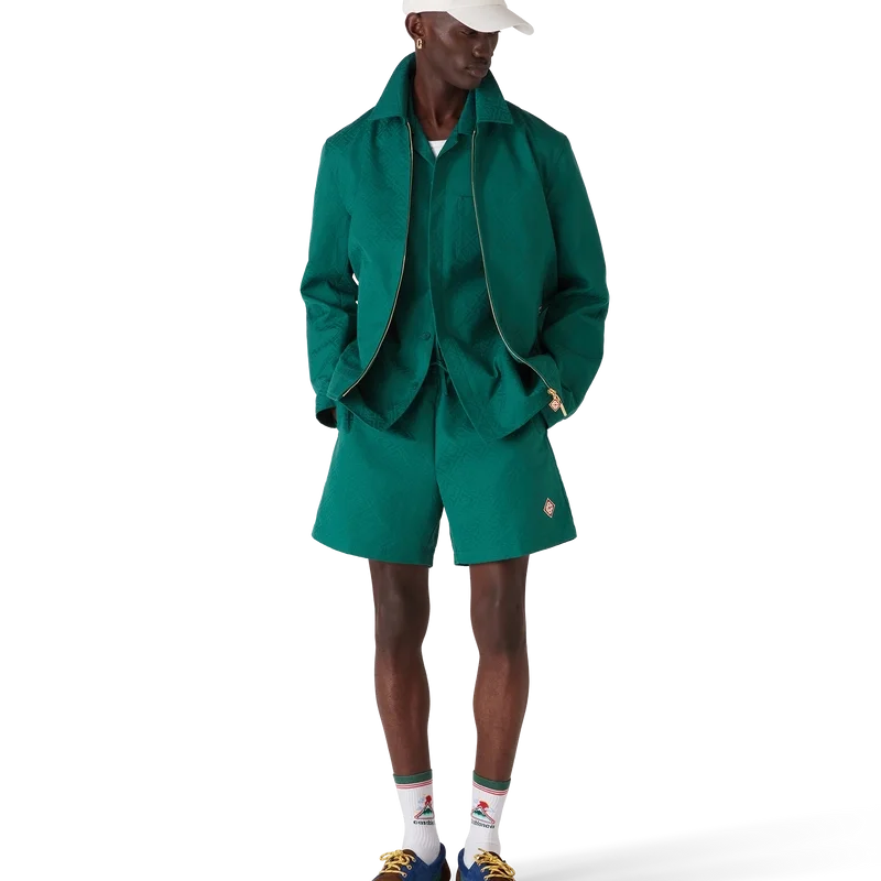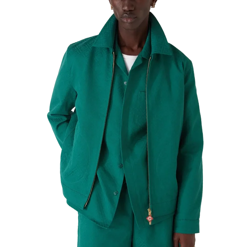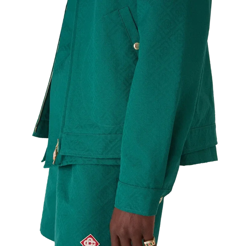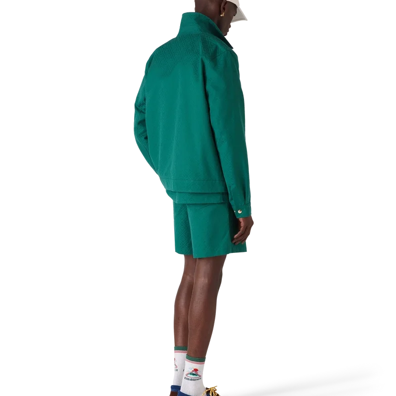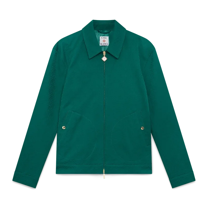 Bomullsjakken med monogramjacquard er en langermet blouson laget av bomullsjacquardstoff. Den har glidelås, tragtkrage, gullbelagte detaljer og skrå lommer med klaff.