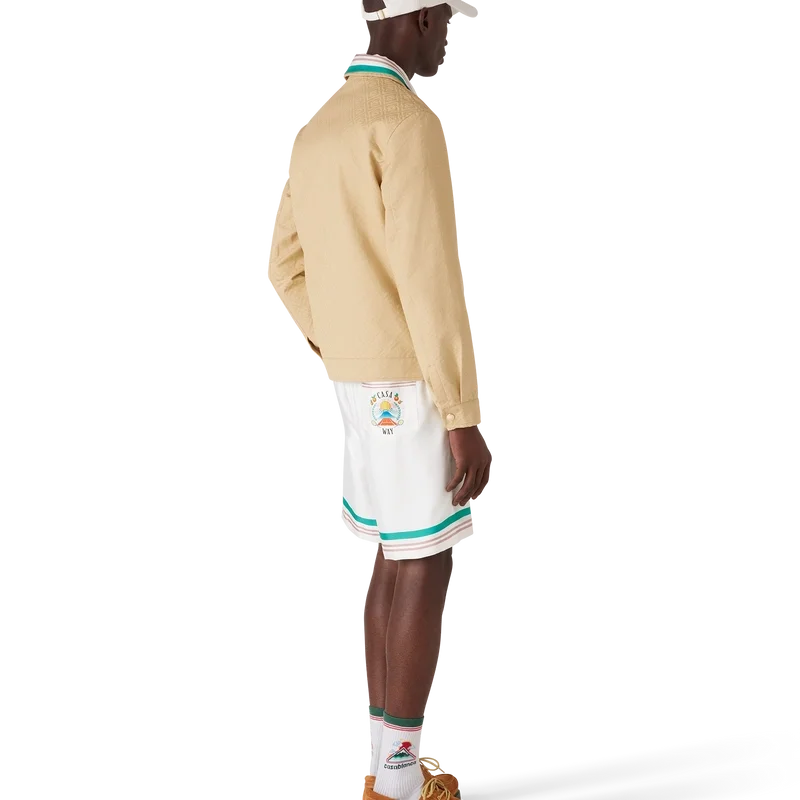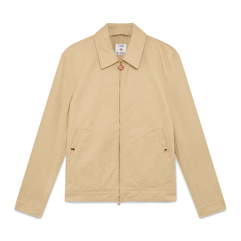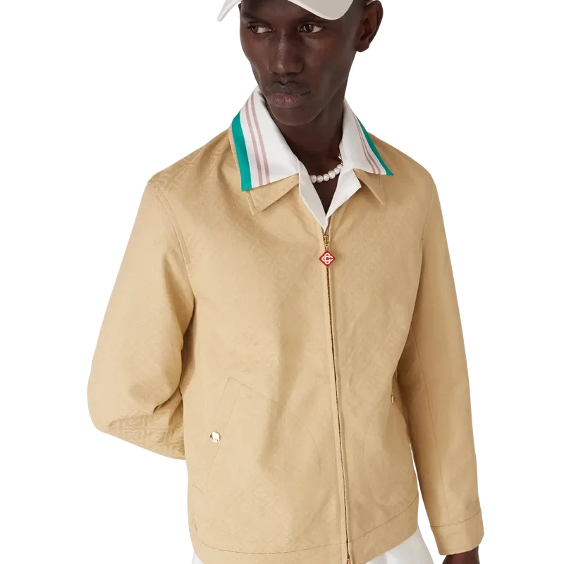 Bomullsjakken med monogramjacquard er en langermet blouson-modell laget av bomullsjacquardstoff. Den har glidelåslukking, tragtkrage, gullbelagte detaljer og skrå lommer med klaff.