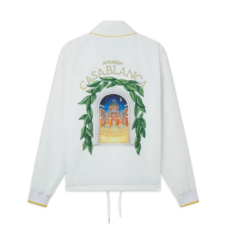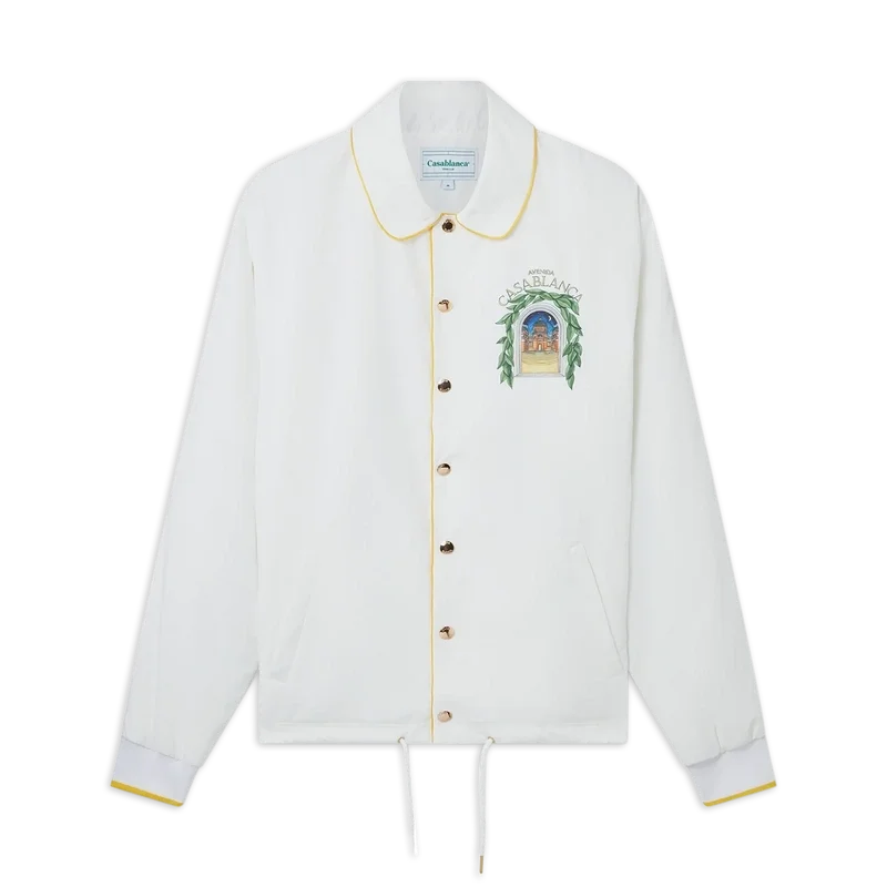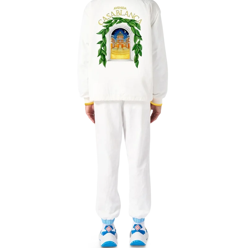 Casablanca Avenida Coach Jacket i hvitt har et sentralt sesongmønster der naturens frie flyt møter strukturen i menneskeskapt design: buen, et abstrakt symbol på styrke. Avsluttet med gul ribb, snøringer og lukking med knapper.