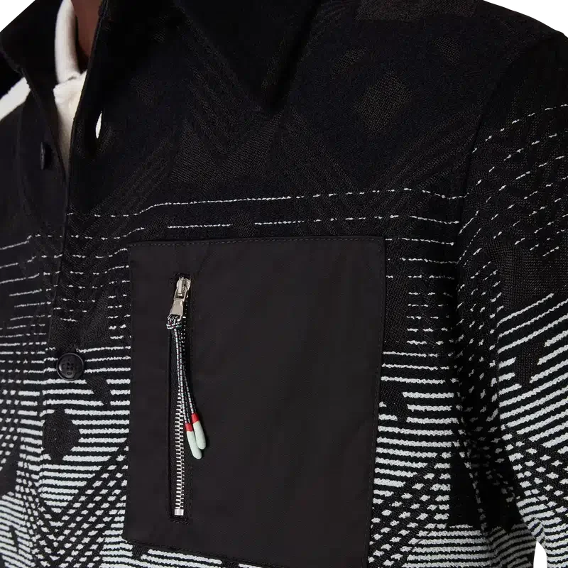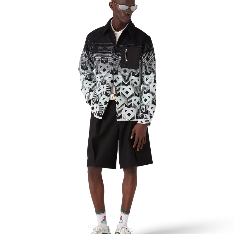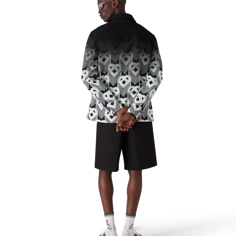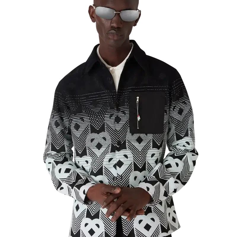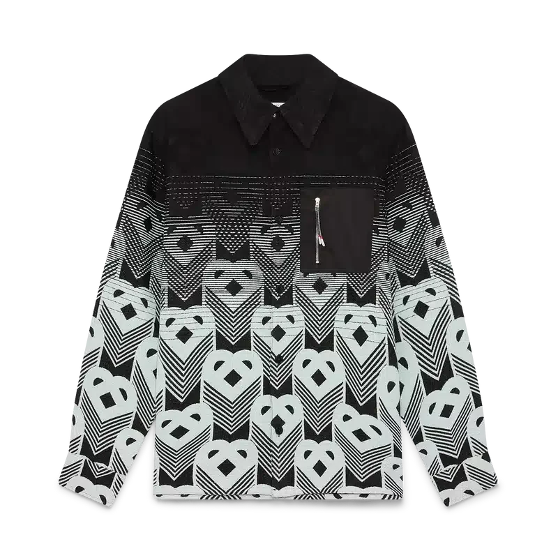Monogram Gradient Shacket er en langermet jakke laget av jacquard-bouclé-stoff. Den har krage, brystlomme, knappelukking og gullbelagte knapper med merke.