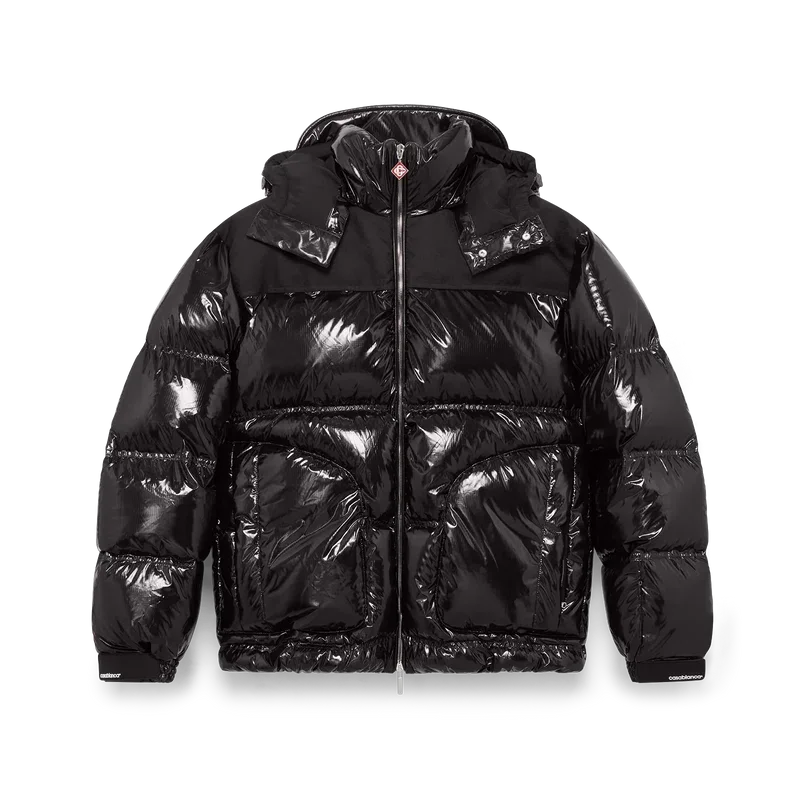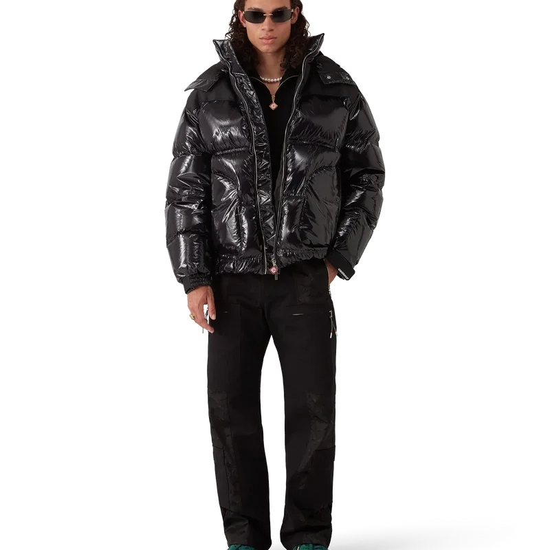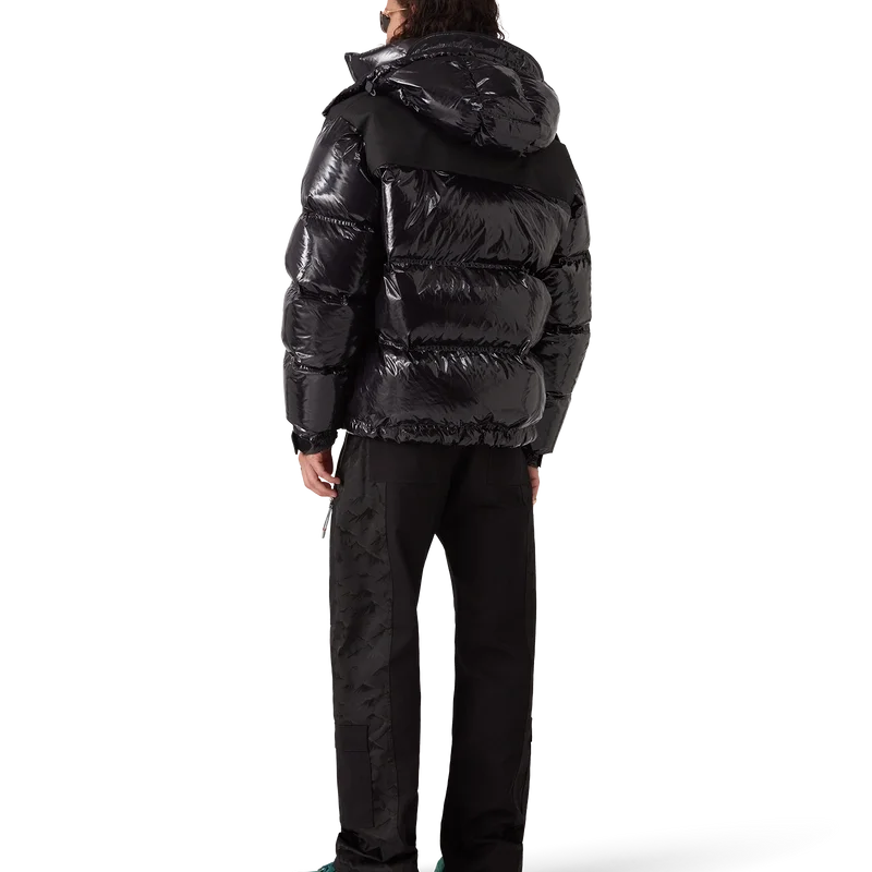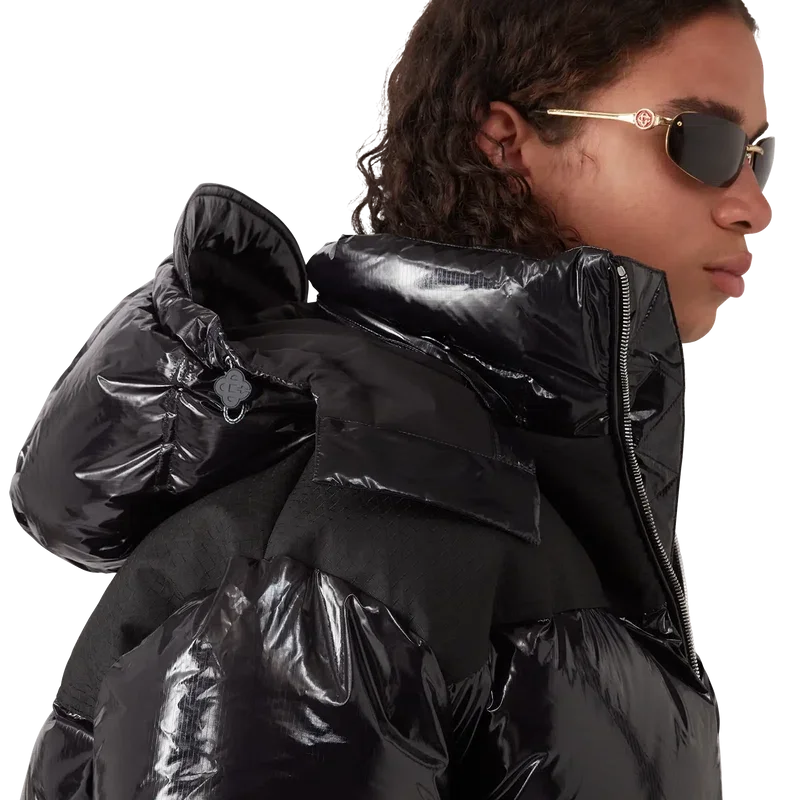 Nylon-dunjakken er et moderne, boksformet yttertøydesign laget av ripstop-nylonstoff med dunfyll og kontrastfarget monogram-jacquardpanel over skuldrene. Den har hette med Cc-logo-knapper og snøring, en stående krage som gir ekstra varme og beskyttelse mot vær og vind, glidelås med husets karakteristiske diamantlogo på glidelåstappen, frontlommer med glidelås, justerbare mansjetter med merke og elastisk kant og mansjetter.