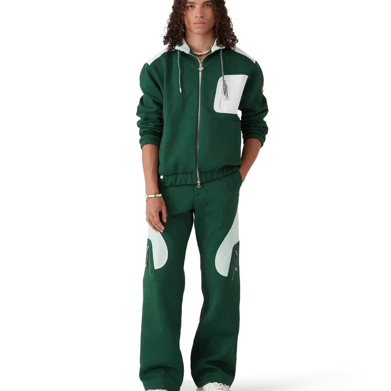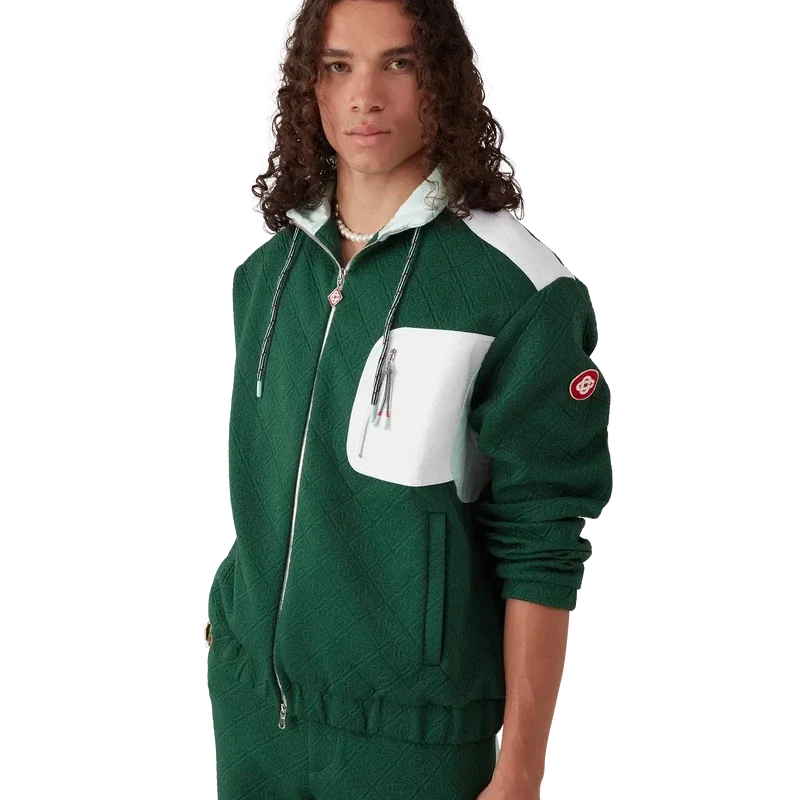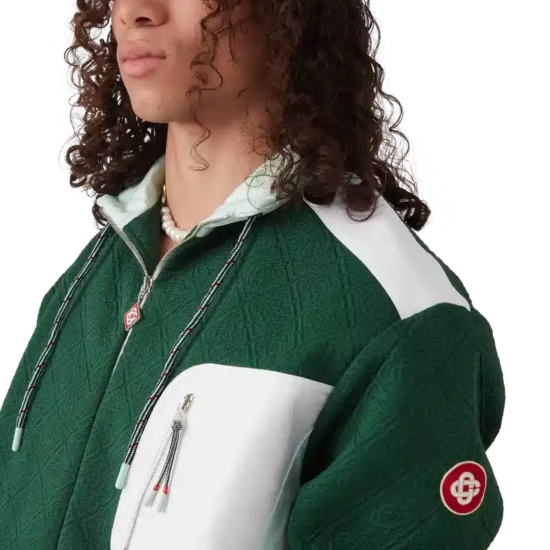 Nylon Monogram Jacquard-jakken er en langermet modell laget av jacquardstrikket stoff. Den har høy krage med snøring, glidelåslukking, vertikale paspolerte lommer og en kontrastfarget brystlomme med glidelåslukking, elastiske mansjetter og nederkant, albuepatcher, husets CC-logo-patch på ermet, ventilasjonshull under armene og meshfôr.