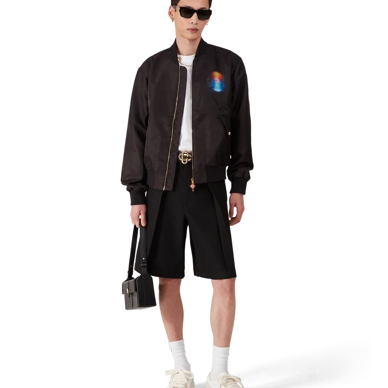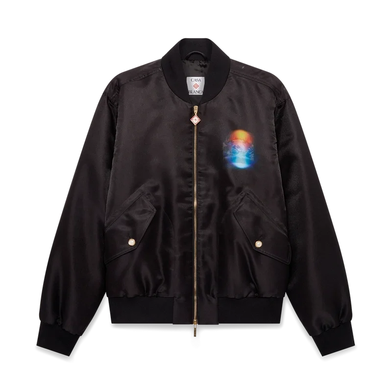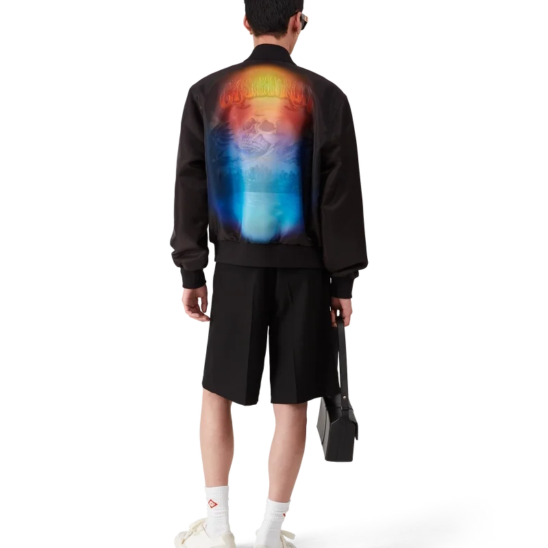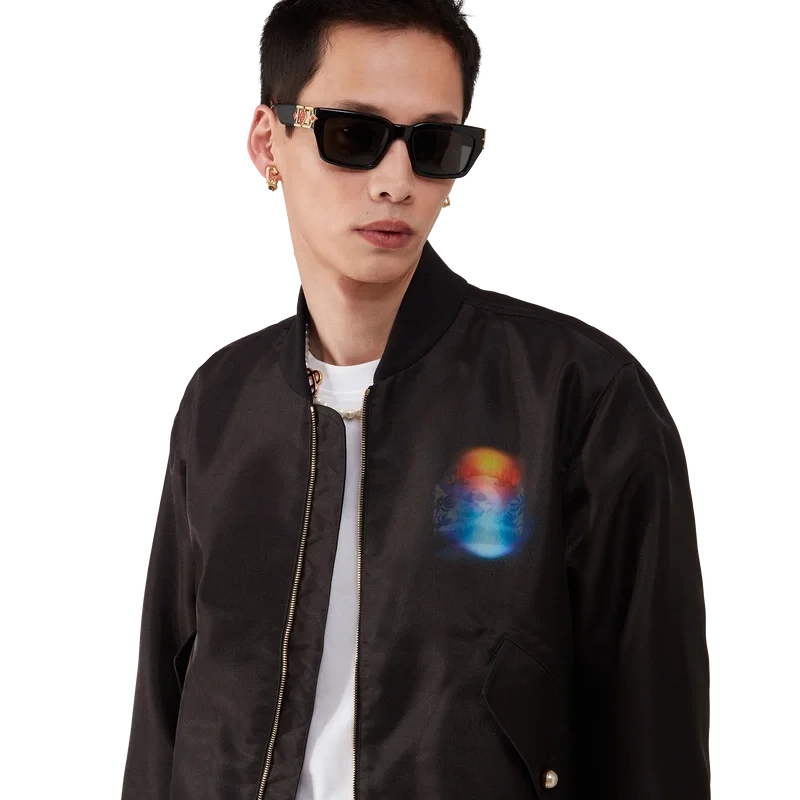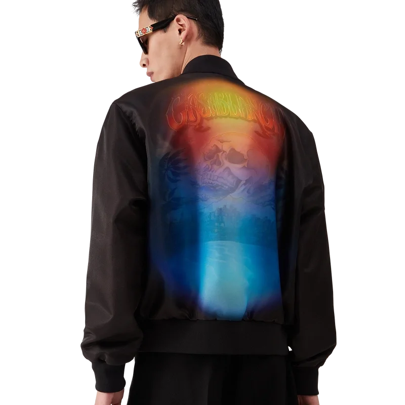 Organza-bomberjakken med fargegradient har en klassisk silhuett og er laget av organza-stoff. Den har sesongens fargegradient og La Pramonition-kunstverk som viser en uhyggelig visjon av La-skyline om natten, med UFO-elementer som henter inspirasjon fra vintage sci-fi – på brystet og ryggen. Fullført med glidelåslukking, frontlommer med klaff og signaturgullkantede perleknapper, samt stående ribbkrage, mansjetter og nederkant.