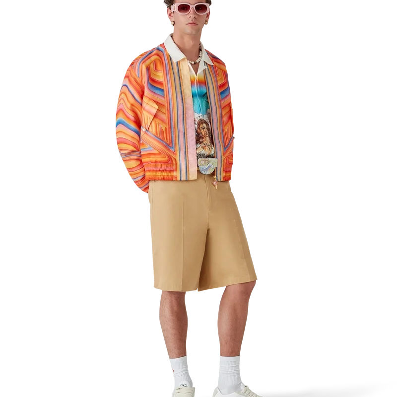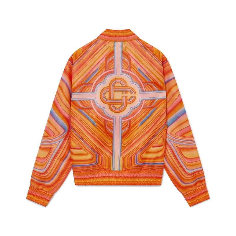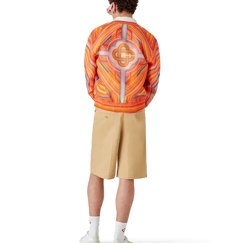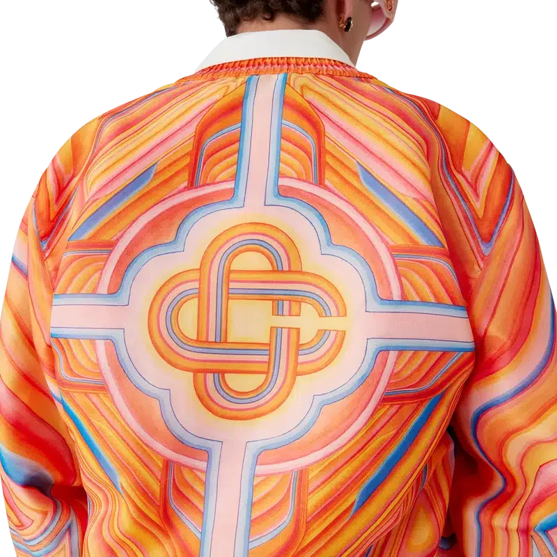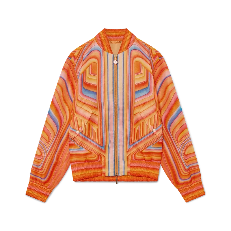 Low Rider Organza bomberjakke er et trykt design med en klassisk silhuett, laget av et teknisk stoff med sesongens Low Rider-kunstverk. Fullført med glidelåslukking med husets signaturdiamantlogo på glidelåstappen, frontlommer med klaff og signaturgullkantede perleknapper, samt ribbestrikket stående krage, mansjetter og nederkant.