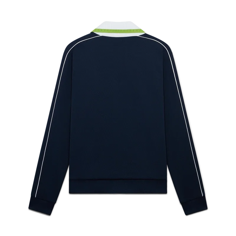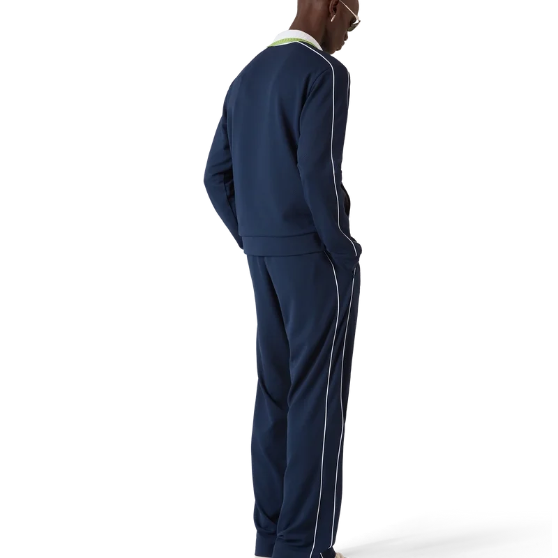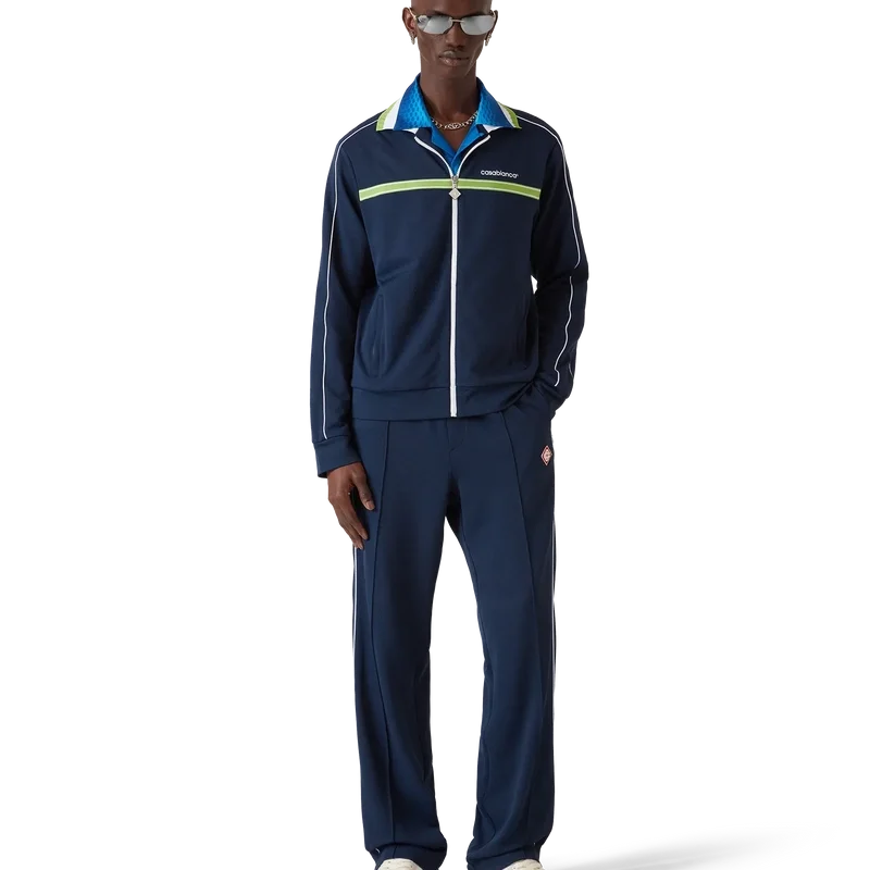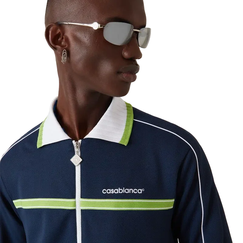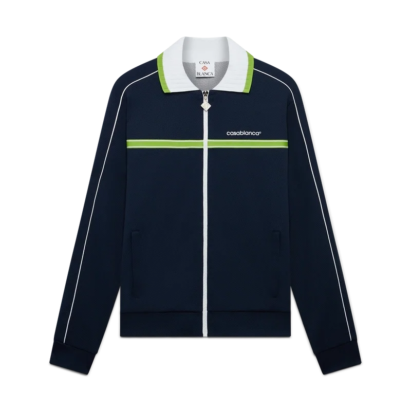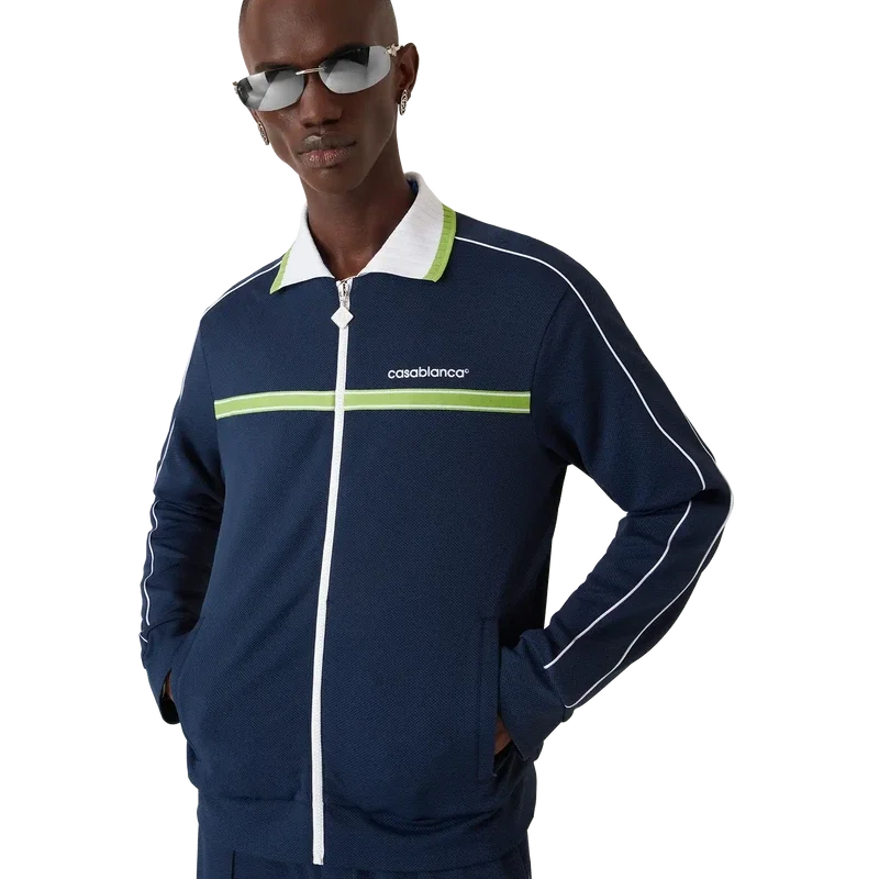 Pique-treningsjakken er et klassisk sportsplagg med lange ermer og husets Casablanca-logo. Den har glidelås med husets karakteristiske diamantlogo på glidelåstappen, ribbestrikket krage, grønne og hvite striper på brystet, pipingdetaljer på skuldrene og nedover ermene, fôr samt ribbestrikkede detaljer i nederkant og mansjetter.