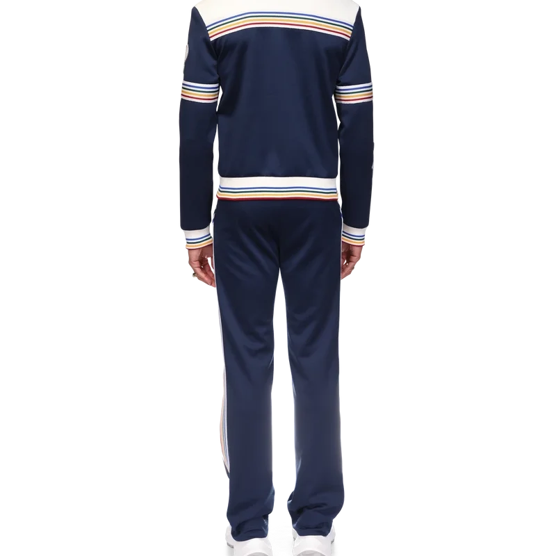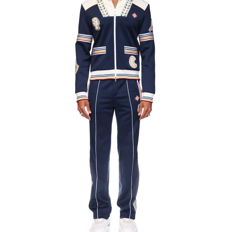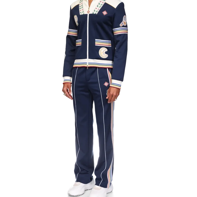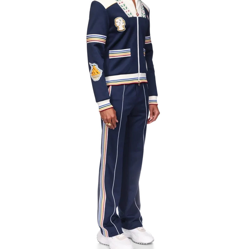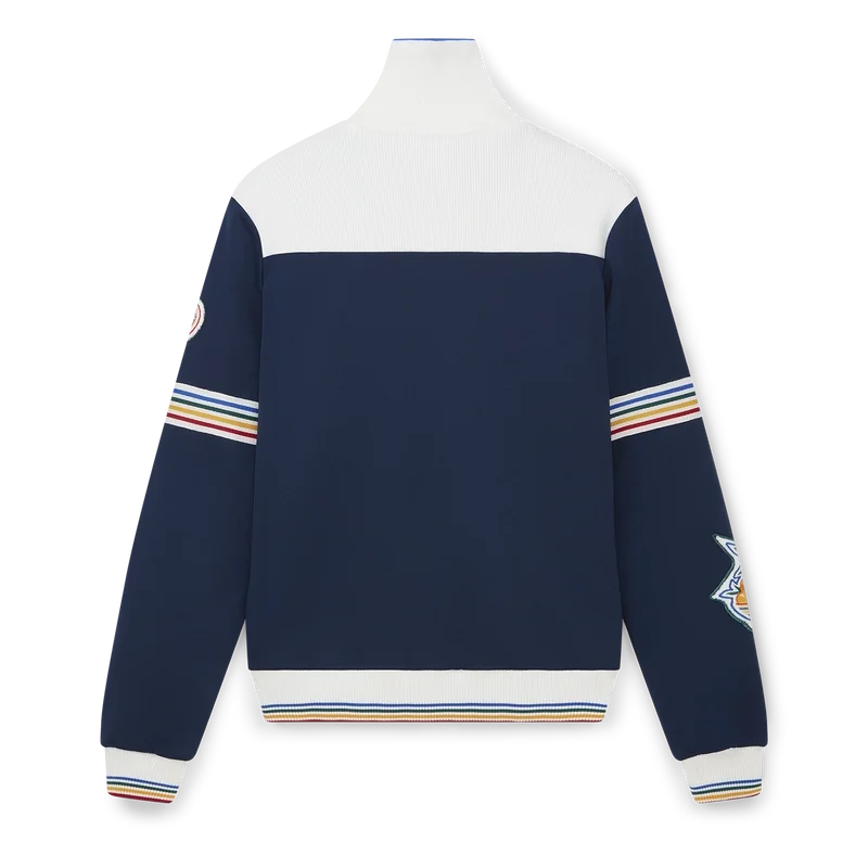 Varsity-treningsjakken er en langermet modell laget av trikotstoff med husets karakteristiske diamantlogo. Fullført med glidelåslukking, gresk ikonografi, tennis, oransje pyramide, måne, flerfarget stripetape på ermene, ryggen og lommene, flerfargede ribbede mansjetter,
